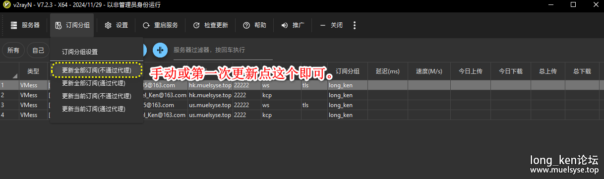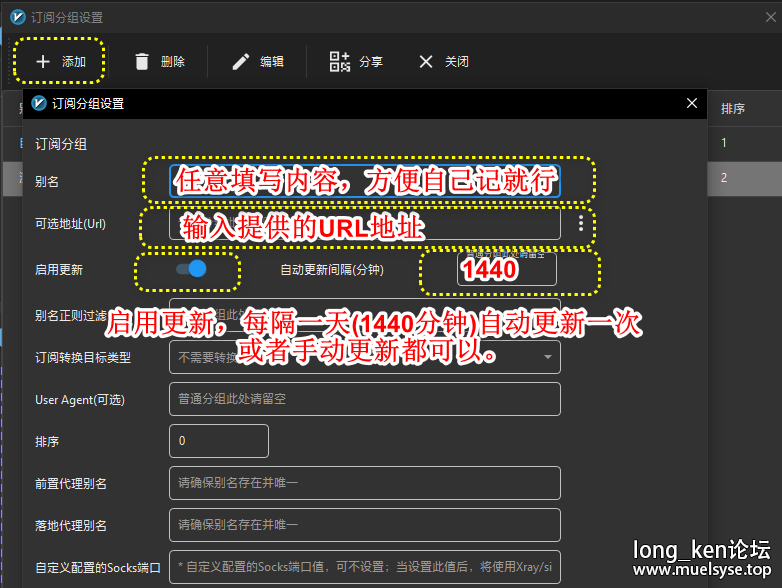 为进一步节省时间和变更改动的时间,也方便减少与使用者的频繁交流,此次尝试使用订阅链接方法。此次更新之后,将无需多次导入连接,而只需要点击自动更新或手动更新即可。