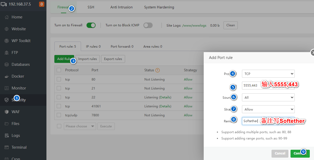 2.如果你的云服务器或者供应商还有防火墙,请在防火墙放行后台所提示的端口,如“release the following port (41061|888|80|443|20|21) in the security group”,相当于是在防火墙放行41061,888,80,443,20,21端口,其实只需要41061和888端口即可,当然你也可以选择放行“全部端口”。如果你服务商没有此类防火墙,可以直接跳过此步骤。